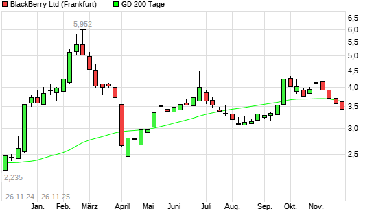 Mit dem Rücksetzer auf 3,58 EUR hat die Blackberry-Aktie am 25.11.2025 die 200-Tage-Linie nach unten gekreuzt.