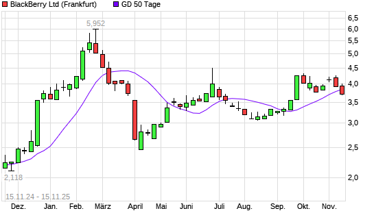 Mit dem Rücksetzer auf 3,71 EUR hat die Blackberry-Aktie am 14.11.2025 die 50-Tage-Linie nach unten gekreuzt.