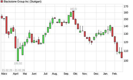 Mit dem Rücksetzer auf 103,44 EUR hat die Blackstone-Aktie (ISIN US09260D1072) am 20.02.2026 ein neues 12-Monats-Tief erreicht und damit den Kurs vom 05.02.2026 eingestellt.