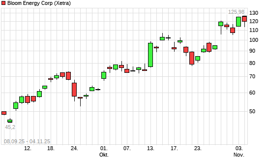Mit dem Anstieg auf 124,80 EUR hat die Bloom Energy A-Aktie (ISIN US0937121079) am 03.11.2025 ein neues All-Time-High erreicht und damit den Kurs vom 29.10.2025 eingestellt.