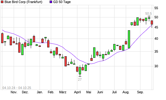 Mit dem Anstieg auf 46,40 EUR hat die Blue Bird-Aktie am 03.10.2025 die 50-Tage-Linie nach oben gekreuzt.
