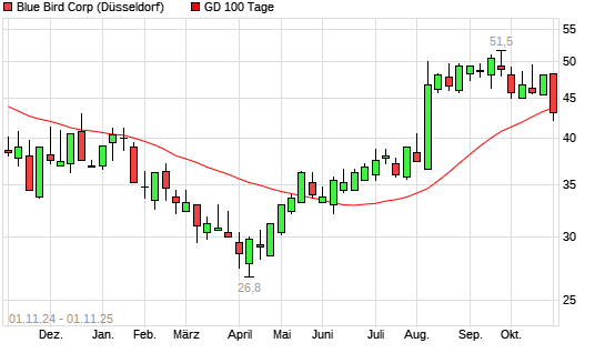 Mit dem Rücksetzer auf 41,80 EUR hat die Blue Bird-Aktie am 31.10.2025 die 100-Tage-Linie nach unten gekreuzt.