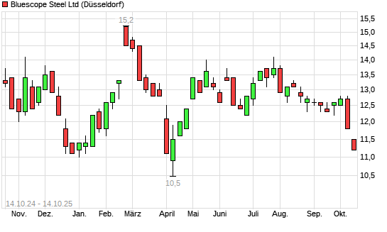 Mit dem Rücksetzer auf 11,60 EUR hat die BlueScope Steel-Aktie (ISIN AU000000BSL0) am 13.10.2025 ein neues 6-Monats-Tief erreicht und damit den Kurs vom 14.04.2025 eingestellt.
