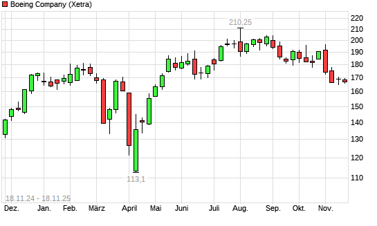 Mit dem Rücksetzer auf 165,00 EUR hat die Boeing-Aktie (ISIN US0970231058) am 17.11.2025 ein neues 6-Monats-Tief erreicht und damit den Kurs vom 10.11.2025 eingestellt.