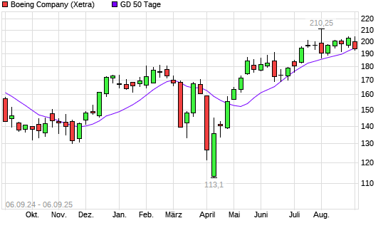 Mit dem Rücksetzer auf 192,88 EUR hat die Boeing-Aktie am 05.09.2025 die 50-Tage-Linie nach unten gekreuzt.