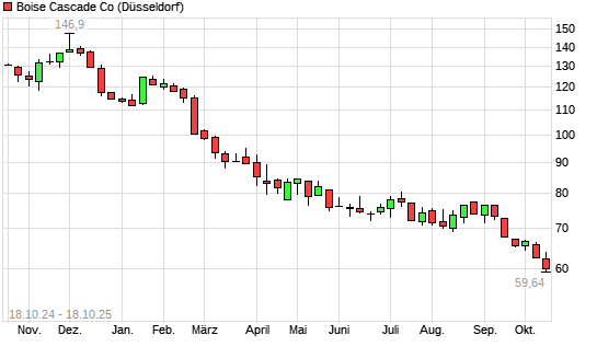 Mit dem Rücksetzer auf 59,24 EUR hat die Boise Cascade-Aktie (ISIN US09739D1000) am 17.10.2025 ein neues 12-Monats-Tief erreicht und damit den Kurs vom 14.10.2025 eingestellt.