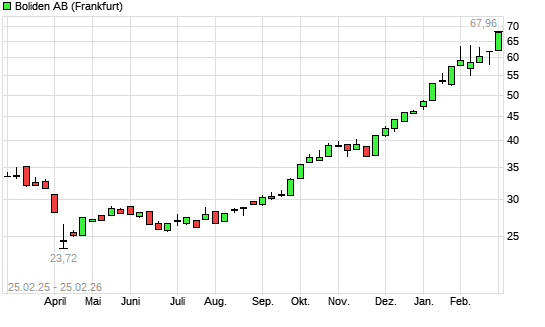 Mit dem Anstieg auf 65,00 EUR hat die Boliden AB-Aktie (ISIN SE0020050417) am 24.02.2026 ein neues All-Time-High erreicht und damit den Kurs vom 11.02.2026 eingestellt.