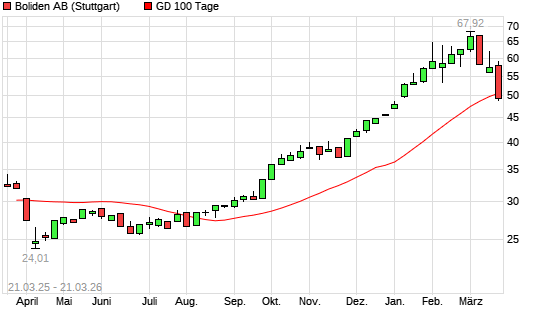 Mit dem Rücksetzer auf 49,70 EUR hat die Boliden AB-Aktie am 20.03.2026 die 100-Tage-Linie nach unten gekreuzt.