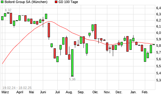 Mit dem Anstieg auf 5,81 EUR hat die Bollore-Aktie am 17.02.2025 die 100-Tage-Linie nach oben gekreuzt.