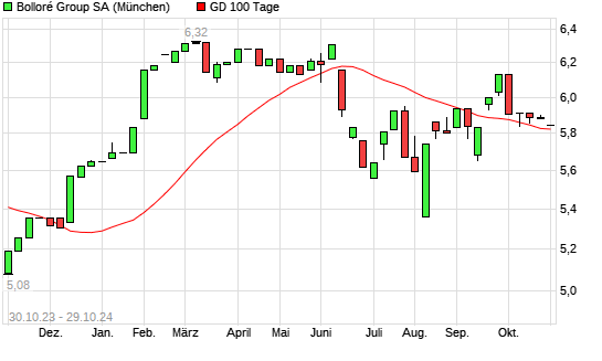 Mit dem Rücksetzer auf 5,80 EUR hat die Bollore-Aktie am 28.10.2024 die 100-Tage-Linie nach unten gekreuzt.
