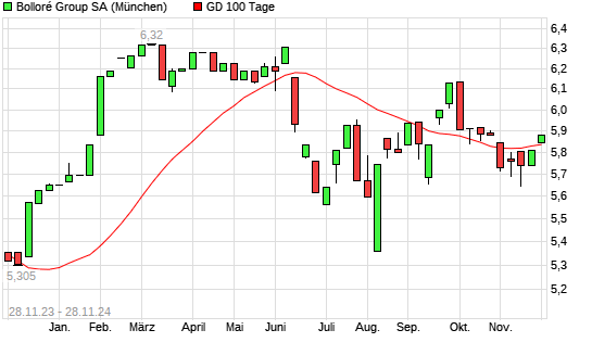 Mit dem Rücksetzer auf 5,78 EUR hat die Bollore-Aktie am 27.11.2024 die 100-Tage-Linie nach unten gekreuzt.