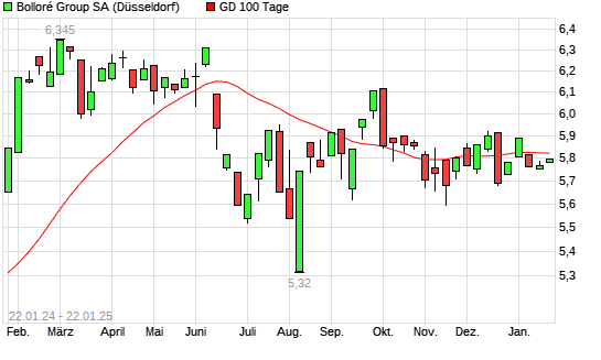 Mit dem Rücksetzer auf 5,81 EUR hat die Bollore-Aktie am 21.01.2025 die 100-Tage-Linie nach unten gekreuzt.