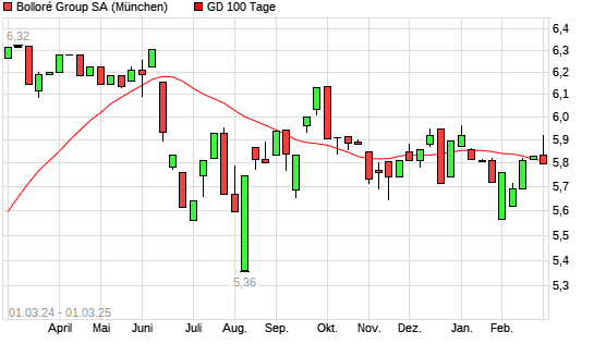 Mit dem Rücksetzer auf 5,74 EUR hat die Bollore-Aktie am 28.02.2025 die 100-Tage-Linie nach unten gekreuzt.