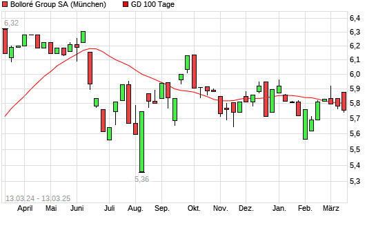 Mit dem Rücksetzer auf 5,70 EUR hat die Bollore-Aktie am 12.03.2025 die 100-Tage-Linie nach unten gekreuzt.
