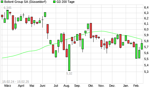 Mit dem Rücksetzer auf 5,77 EUR hat die Bollore-Aktie am 14.02.2025 die 200-Tage-Linie nach unten gekreuzt.