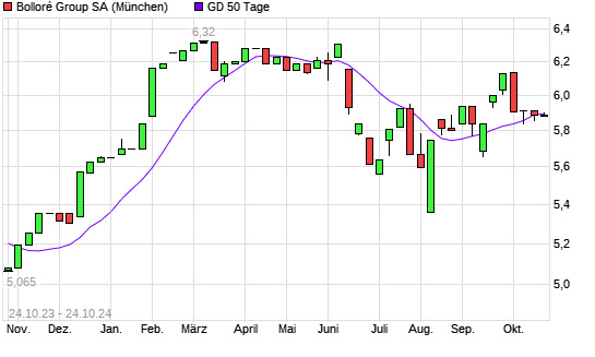 Mit dem Rücksetzer auf 5,85 EUR hat die Bollore-Aktie am 23.10.2024 die 50-Tage-Linie nach unten gekreuzt.