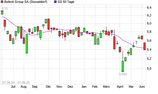 Mit dem Rücksetzer auf 5,40 EUR hat die Bollore-Aktie am 06.06.2025 die 50-Tage-Linie nach unten gekreuzt.