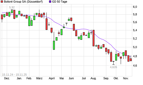 Mit dem Rücksetzer auf 4,72 EUR hat die Bollore-Aktie am 14.11.2025 die 50-Tage-Linie nach unten gekreuzt.