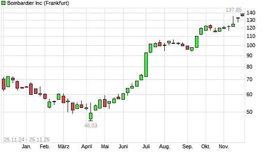 Mit dem Anstieg auf 137,85 EUR hat die Bombardier-Aktie (ISIN CA0977518616) am 24.11.2025 ein neues 10-Jahres-Hoch erreicht und damit den Kurs vom 12.11.2025 eingestellt.