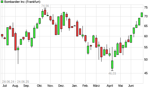 Mit dem Anstieg auf 69,86 EUR hat die Bombardier-Aktie (ISIN CA0977518616) am 23.06.2025 ein neues 6-Monats-Hoch erreicht und damit den Kurs vom 20.06.2025 eingestellt.