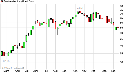 Mit dem Rücksetzer auf 54,08 EUR hat die Bombardier-Aktie (ISIN CA0977518616) am 12.02.2025 ein neues 6-Monats-Tief erreicht und damit den Kurs vom 11.02.2025 eingestellt.