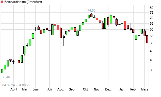 Mit dem Rücksetzer auf 52,24 EUR hat die Bombardier-Aktie (ISIN CA0977518616) am 03.03.2025 ein neues 6-Monats-Tief erreicht und damit den Kurs vom 12.02.2025 eingestellt.