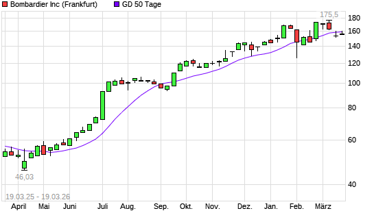 Mit dem Anstieg auf 160,55 EUR hat die Bombardier-Aktie am 18.03.2026 die 50-Tage-Linie nach oben gekreuzt.