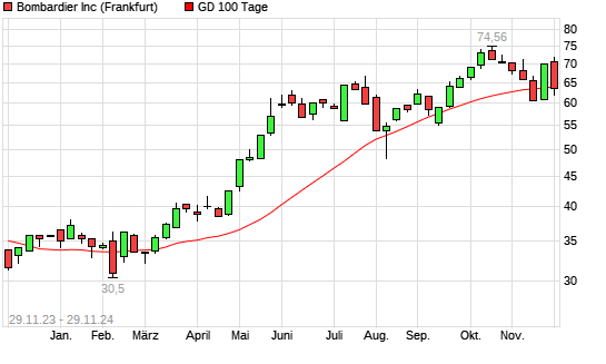 Mit dem Rücksetzer auf 62,02 EUR hat die Bombardier-Aktie am 28.11.2024 die 100-Tage-Linie nach unten gekreuzt.