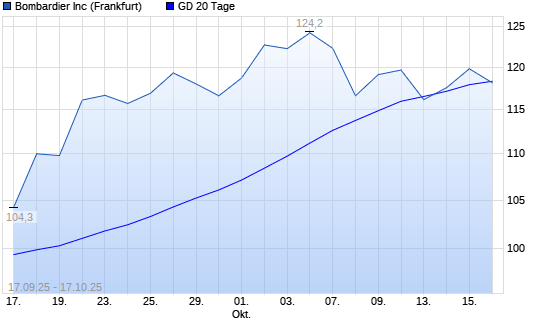 Mit dem Rücksetzer auf 118,15 EUR hat die Bombardier-Aktie am 16.10.2025 die 20-Tage-Linie nach unten gekreuzt.