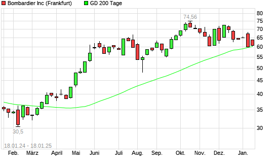 Mit dem Rücksetzer auf 60,72 EUR hat die Bombardier-Aktie am 17.01.2025 die 200-Tage-Linie nach unten gekreuzt.