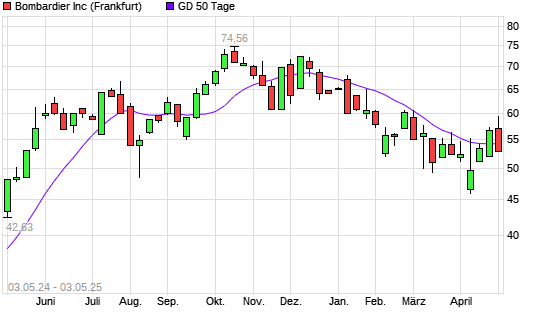 Mit dem Rücksetzer auf 52,78 EUR hat die Bombardier-Aktie am 02.05.2025 die 50-Tage-Linie nach unten gekreuzt.