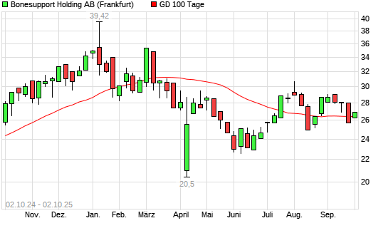 Mit dem Anstieg auf 26,58 EUR hat die Bonesupport Holding-Aktie am 01.10.2025 die 100-Tage-Linie nach oben gekreuzt.
