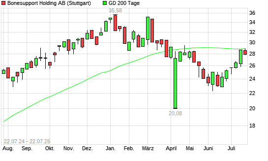 Mit dem Anstieg auf 29,12 EUR hat die Bonesupport Holding-Aktie am 21.07.2025 die 200-Tage-Linie nach oben gekreuzt.