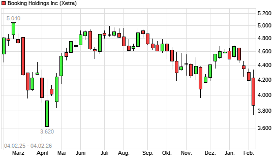 Mit dem Rücksetzer auf 3.914,00 EUR hat die Booking Holdings-Aktie (ISIN US09857L1089) am 03.02.2026 ein neues 12-Monats-Tief erreicht und damit den Kurs vom 08.04.2025 eingestellt.
