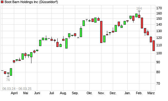 Mit dem Rücksetzer auf 106,00 EUR hat die Boot Barn Holdings-Aktie (ISIN US0994061002) am 05.03.2025 ein neues 6-Monats-Tief erreicht und damit den Kurs vom 04.03.2025 eingestellt.