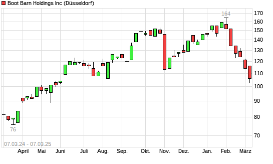 Mit dem Rücksetzer auf 105,00 EUR hat die Boot Barn Holdings-Aktie (ISIN US0994061002) am 06.03.2025 ein neues 6-Monats-Tief erreicht und damit den Kurs vom 05.03.2025 eingestellt.