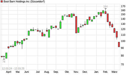 Mit dem Rücksetzer auf 94,00 EUR hat die Boot Barn Holdings-Aktie (ISIN US0994061002) am 11.03.2025 ein neues 6-Monats-Tief erreicht und damit den Kurs vom 10.03.2025 eingestellt.