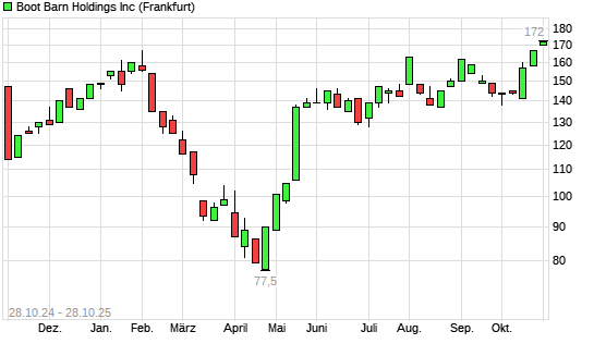 Mit dem Anstieg auf 170,00 EUR hat die Boot Barn Holdings-Aktie (ISIN US0994061002) am 27.10.2025 ein neues All-Time-High erreicht und damit den Kurs vom 24.10.2025 eingestellt.