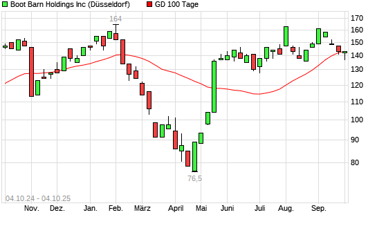 Mit dem Anstieg auf 144,00 EUR hat die Boot Barn Holdings-Aktie am 03.10.2025 die 100-Tage-Linie nach oben gekreuzt.