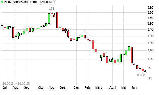Mit dem Rücksetzer auf 85,72 EUR hat die Booz Allen Hamilton-Aktie (ISIN US0995021062) am 25.06.2025 ein neues 12-Monats-Tief erreicht und damit den Kurs vom 23.06.2025 eingestellt.
