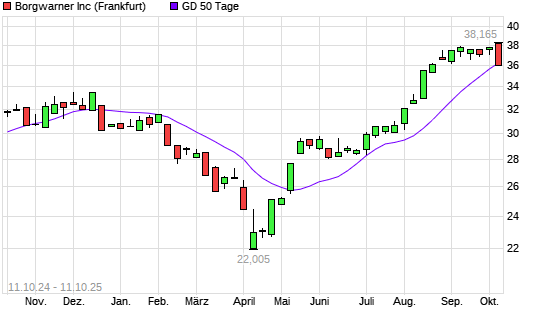 Mit dem Rücksetzer auf 35,97 EUR hat die BorgWarner-Aktie am 10.10.2025 die 50-Tage-Linie nach unten gekreuzt.