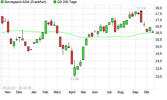 Mit dem Anstieg auf 16,32 EUR hat die Borregaard-Aktie am 15.10.2025 die 200-Tage-Linie nach oben gekreuzt.