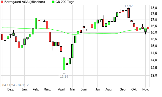 Mit dem Rücksetzer auf 16,06 EUR hat die Borregaard-Aktie am 03.11.2025 die 200-Tage-Linie nach unten gekreuzt.