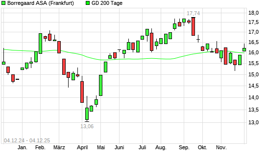Mit dem Rücksetzer auf 15,98 EUR hat die Borregaard-Aktie am 03.12.2025 die 200-Tage-Linie nach unten gekreuzt.