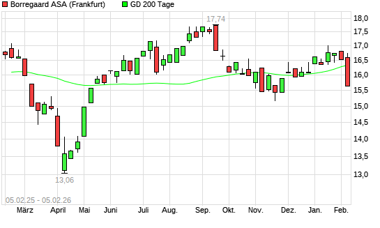 Mit dem Rücksetzer auf 15,74 EUR hat die Borregaard-Aktie am 04.02.2026 die 200-Tage-Linie nach unten gekreuzt.