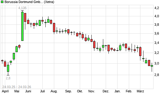 Mit dem Rücksetzer auf 3,00 EUR hat die Borussia Dortmund-Aktie (ISIN DE0005493092) am 23.03.2026 ein neues 6-Monats-Tief erreicht und damit den Kurs vom 20.03.2026 eingestellt.