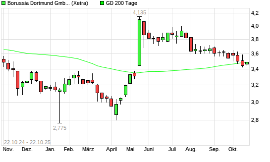 Mit dem Rücksetzer auf 3,46 EUR hat die Borussia Dortmund-Aktie am 21.10.2025 die 200-Tage-Linie nach unten gekreuzt.
