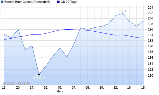 Mit dem Anstieg auf 197,80 EUR hat die Boston Beer-Aktie am 17.03.2026 die 20-Tage-Linie nach oben gekreuzt.