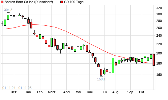 Mit dem Rücksetzer auf 176,70 EUR hat die Boston Beer-Aktie am 31.10.2025 die 100-Tage-Linie nach unten gekreuzt.