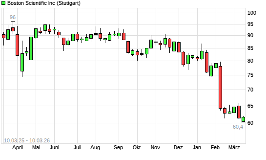 Mit dem Rücksetzer auf 60,40 EUR hat die Boston Scientific-Aktie (ISIN US1011371077) am 09.03.2026 ein neues 12-Monats-Tief erreicht und damit den Kurs vom 04.03.2026 eingestellt.